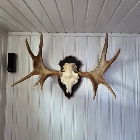 Älghorn monterad på träsköld