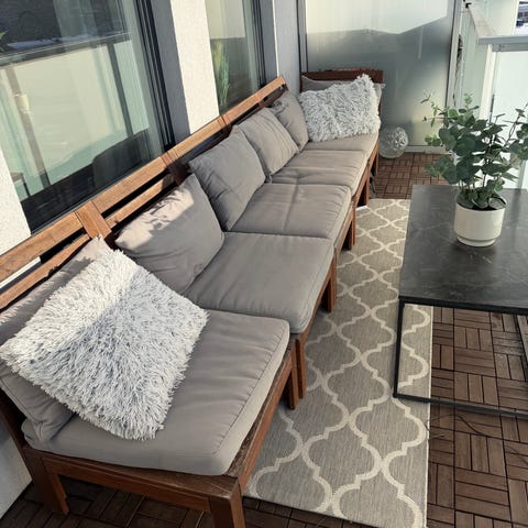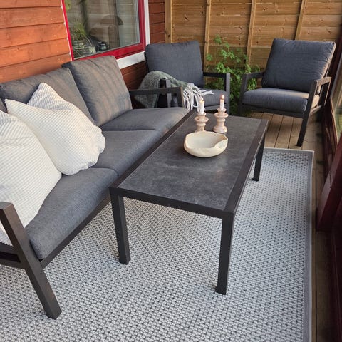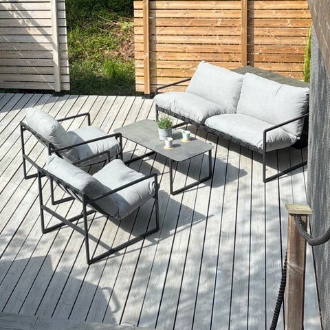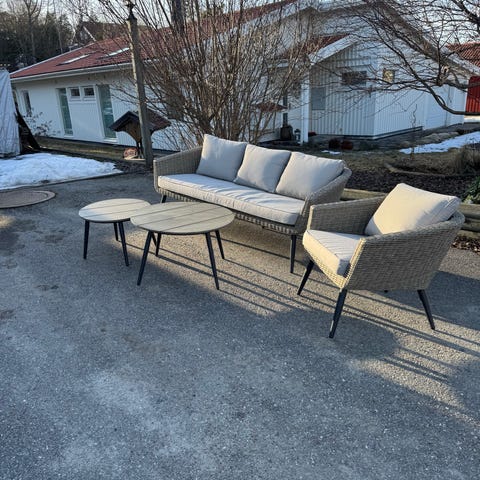 Trädgårdsgrupp bestående av två soffor/fåtöljer och ett rektangulärt bord. Stomme i vitlackerad metall, aluminium, med grå sitt- och ryggdynor. Bordsskiva i grått material och kryssben i metall. Passar för uteplats, altan eller balkong som sittgrupp för flera personer.