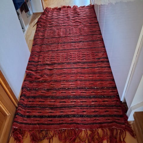 IKEA matta i vacker djupröd färg. Rektangulär modell med fransar på kortsidorna. Passar exempelvis i vardagsrum eller sovrum på trägolv eller andra hårda golvytor.