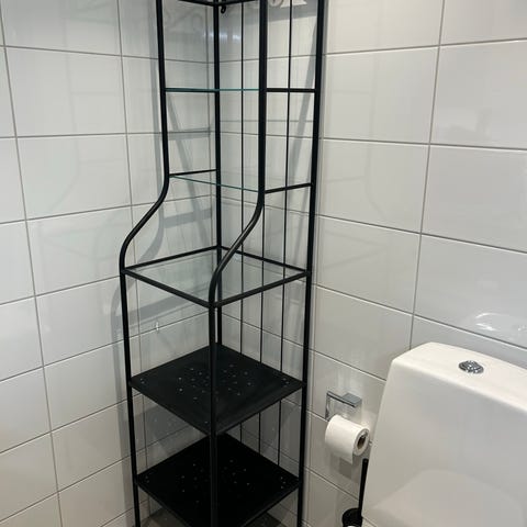 Hyllställ i trä med flera hyllplan. Öppen modell med ribbade hyllplan som lämpar sig för förvaring i till exempel badrum, hall eller förråd.
