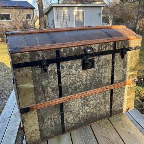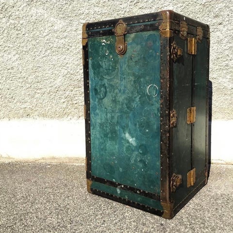 Äldre koffert med gröna sidor och svarta kanter. Utrustad med metallbeslag, lås och handtag på sidorna. Invändigt röd- och vitrandigt tygfoder med etiketter på insidan av locket. Passar som förvaring eller inredningsdetalj i hemmet, exempelvis för textilier, leksaker eller andra föremål. Mått tillkommer, skriv om jag ska mäta den snabbare :)