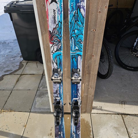 Vattenskidor i blått och svart mönster med justerbara bindningar. Bindning ändringsbar. Ca 20cm till 26cm så storlek 30 till 40