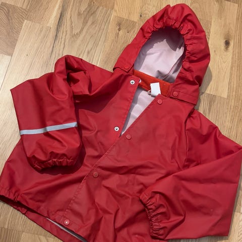 Polarn O. Pyret rött regnställ i galon och fleecejacka i storlek 86. Fint använt skick. Säljs för 300 kr tillsammans.