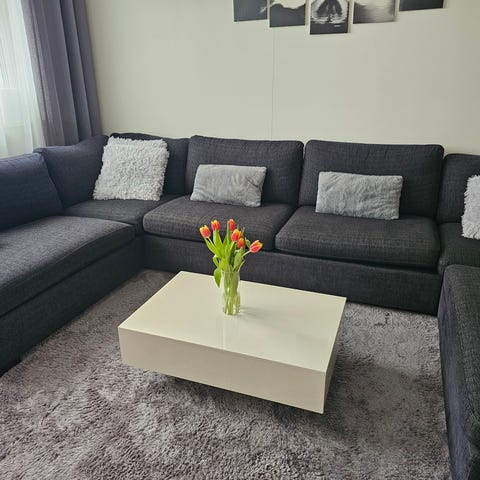 Soffbord svart stålkonstruktion med betongskiva. 90x90 höjd 45 säljes pga flytt