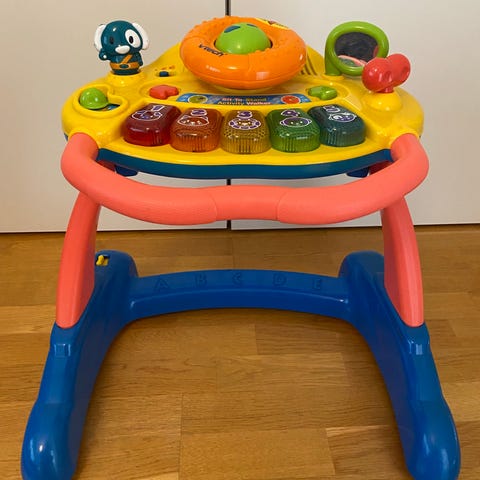 En lära gå vagn med en aktivitetsbräda. Man kan spela olika ljud på den när man trycker på knapparna.