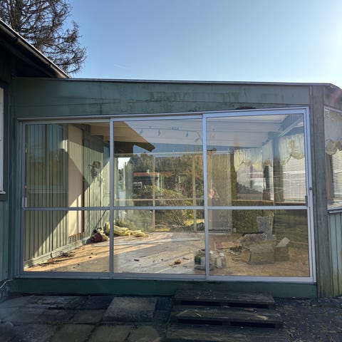 Inglasning till altan med fönster och skjutdörrar i karm av vitlackerade aluminiumprofiler. Består av dubbla skjutdörrar 2x 150 cm breda och 193 cm höga. Ett fönsterparti med sektioner av skjutbara fönster 100 x 105 cm samt ett fönsterparti med 2 sektioner av skjutbara fönster 2 x 150 cm breda och 100cm höga.