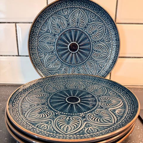 4 st mindre tallrikar 19,5 i diameter. Finns en femte om du vill ha ett udda antal! Vag stämpel i svart på baksidan men kan inte tyda den.