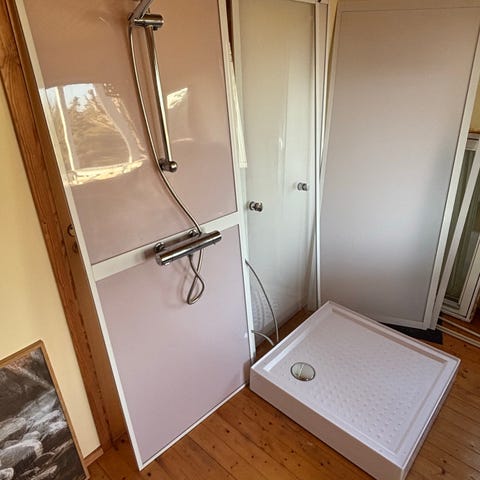 Duschkabin med tillhörande blandare och duschmunstycke