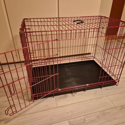 Hundbur och valphage i svart metall. Bur med gallerkonstruktion och löstagbar bottenbricka. Valphagen består av flera sektioner som kan ställas i olika former för att anpassas efter utrymmet. Lämpligt för mindre hundar eller valpar, till exempel för vila, transport i hemmet eller som avgränsat utrymme inomhus.