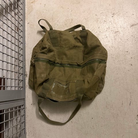 Militär ryggsäck i grön canvas. Väskan har bärremmar baktill och en utanpåficka med lock. Materialet är kraftigt tyg anpassat för utomhusbruk. Passar för exempelvis friluftsliv, vandring eller som enklare packpåse.