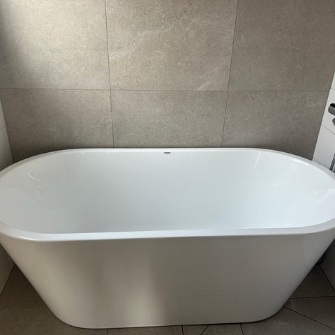 75 cm brett. 150 cm långt. Ser modernt ut och har fräsch vit färg. Inte gulnat på något sätt. Märke cersanit.köpt 2011