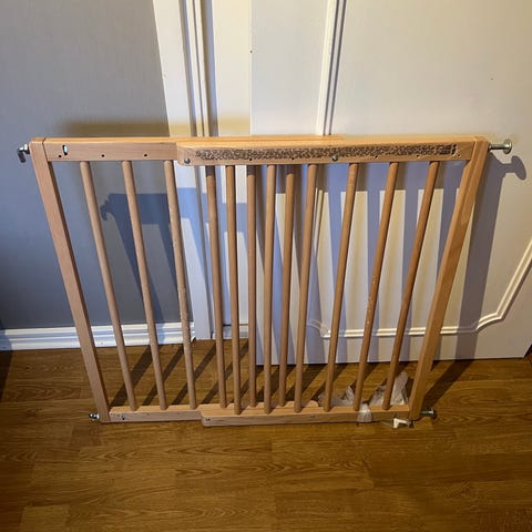 Två barngrindar i trä som passar för trapp eller dörröppning. Använda men fyller fortfarande sin funktion.