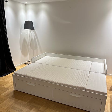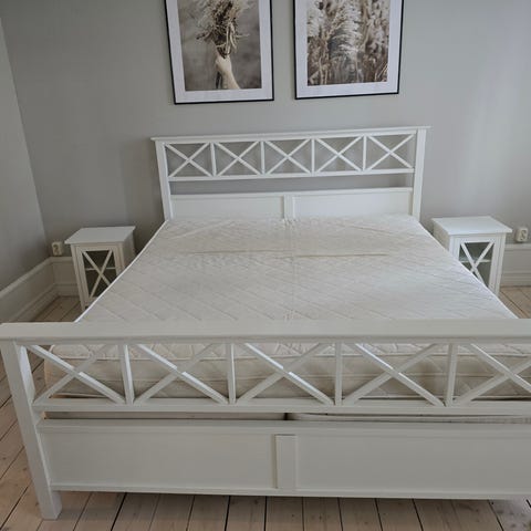 Sängen är I fint skick. små märken kan förekomma. Finns en tillhörande hylla till sänggaveln som ligger kvar i förpackningen.