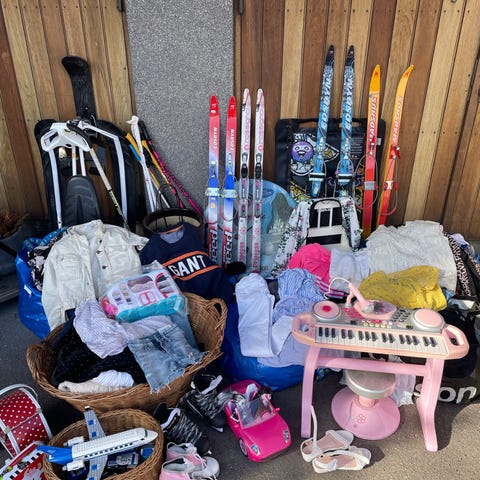 Barnkläder, leksaker, kläder för vuxna, resesäng, gungor, service och takräcken etc.