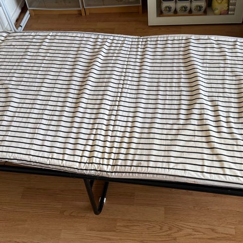 IKEA bäddmadrass med fällbar sängram. Sängen har en metallram som kan fällas ihop för enkel förvaring. Madrassen har ett randigt överdrag. Passar som extrasäng eller gästsäng i hemmet, till exempel i gästrum eller vardagsrum där sängen behöver kunna ställas undan när den inte används.