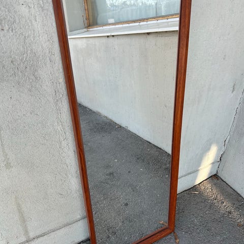 STOR FIN RETRO SPEGEL i teak och grön glasdekor från 1960-tal i fint skick se bilder.