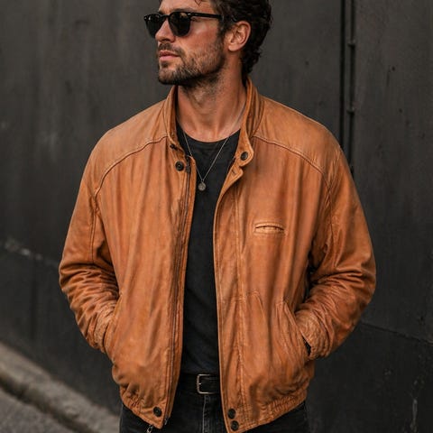 Crocker skinnjacka för herr i storlek L. Jackan är brun och tillverkad i läder med quiltat innerfoder. Från 1980 made in Korea såld i Borås.