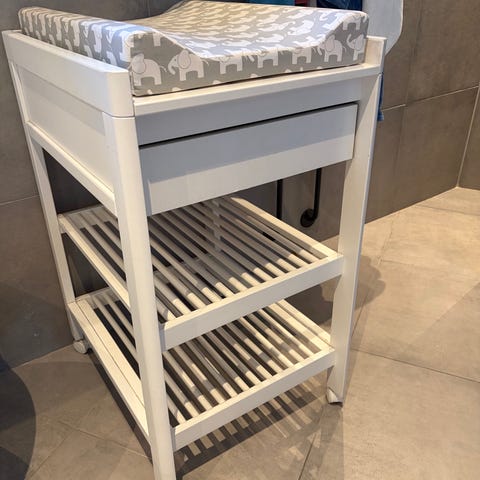 Liten påhängd hylla och skötbädd med avtagbar klädsel ingår.