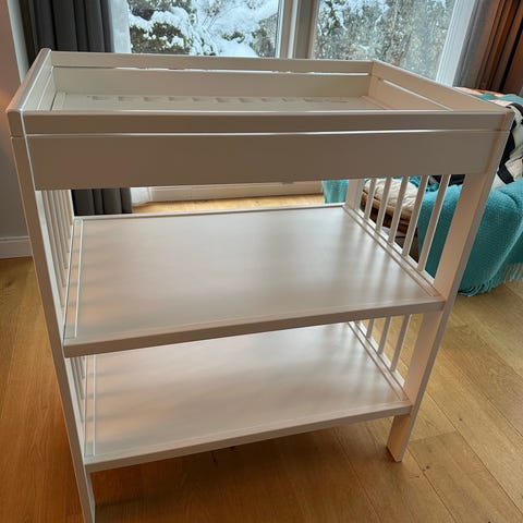IKEA Gulliver skötbord i fint skick. Skötbordet har en öppen design med två hyllplan undertill för förvaring av blöjor, kläder och tillbehör. Överkanten har kanter runtom för att hålla skötbädden på plats.