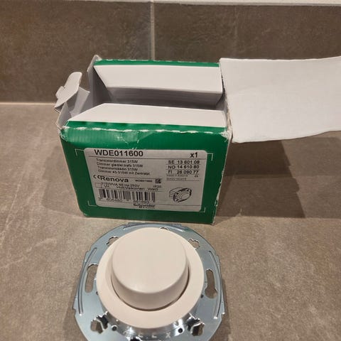 Vadsbo LD200KRON dosdimmer för 230 VAC, 2–100 VA, tillsammans med flera vägguttag i vit färg. Dosdimmern är avsedd för infällt montage i apparatdosa och har anslutningar för fas, nolla och styringångar (S1, S2). Vägguttagen är infällda dubbeluttag med vita ramar, anpassade för inomhusbruk. Produkten kan användas för styrning och anslutning av belysning och andra elektriska apparater i hem- eller kontorsmiljö där dimring och fasta eluttag önskas.