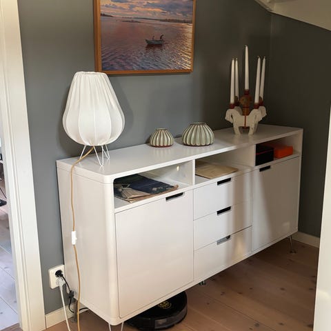 Vit skänk med bänkskiva i marmorimitation från Jysk, 3 lådor och 2 hyllor, mycket bra skick. 180*80*45