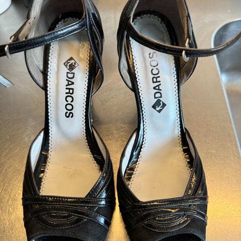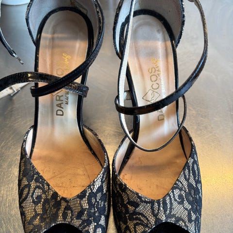 Tahari klackskor i storlek 38. Skorna är svartvita med T-rem och öppen tå. Ovandel i blankt material med kontrasterande vita detaljer. Klackhöjd är 9 cm smal klack. Passar som damskor till exempelvis fest eller mer uppklädda tillfällen.