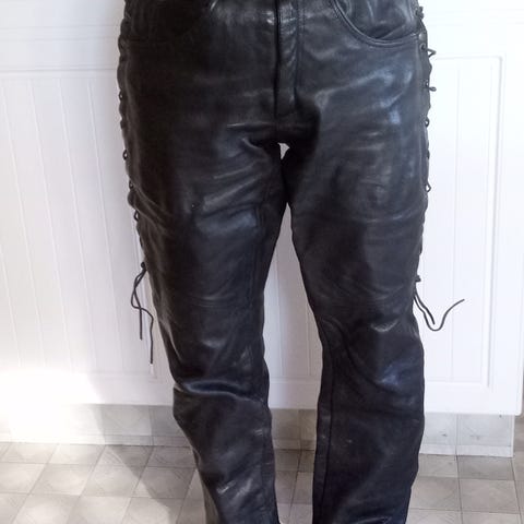 Svarta läderbyxor för dam i storlek 34. Byxorna är tillverkade i läder och har hög midja med knapp- och dragkedjestängning framtill. Förstärkt hårt skydd över knäna. Hämtas helst i Uppsala eller Stockholm.