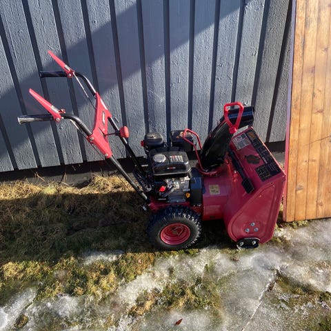 Utrustad med Briggs-motor på ca 5,5 hk, arbetsbredd 80 cm, justerbart/fällbart styre, 2 framåtväxlar och 1 backväxel samt transporthjul.