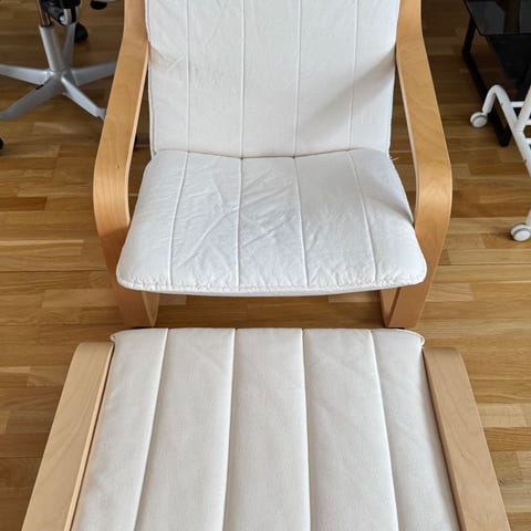 IKEA fåtölj i björk med nytvättad klädsel och tillhörande pall