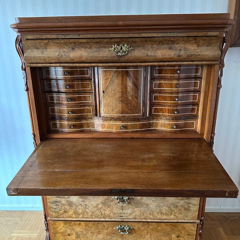 Sekretär skrivbord i Rosenholz med intarsia och mässingsdetaljer
