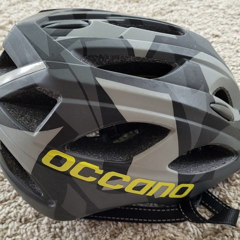 Prowell cykelhjälm med kamouflagemönster i mörka och ljusa gröna, grå och svarta toner. Hjälmen har flera ventilationsöppningar och justerbart spänne under hakan samt justeringsratt i nacken för bättre passform. Passar för cykling i vardag och fritid, enligt lapp på hjälmen även rullskidor, inlines, skateboard, kickboard. Dock ej motordriven cykel eller moped. EN 1078, och CE certifierad. Har inte varit involverad i fall eller olyckor. Vikt 260 gram. Se foton.