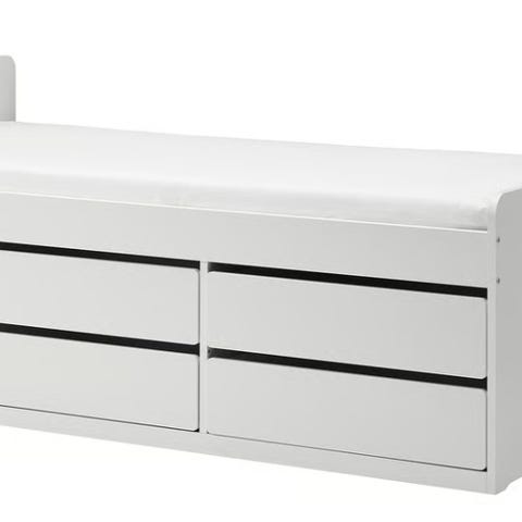 IKEA SLÄKT med förvaring i vit färg. Sängen har flera lådor som ger gott om förvaringsutrymme för exempelvis sängkläder, leksaker eller kläder. Mått enligt bild: längd ca 206 cm, bredd ca 96/129 cm och höjd ca 89 cm. Passar som enkelsäng i sovrum, barnrum eller gästrum. Lådorna kommer monterade men stommen är redan nedmonterad.