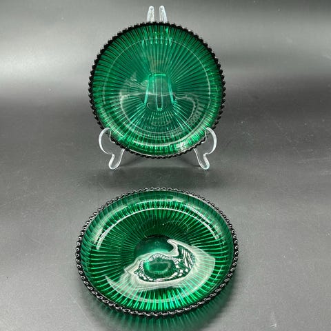 Dekorativt räfflat mönster i grönt pressglas med karaktäristisk pärlkant. Klassisk svensk glasdesign från mitten av 1900-talet.