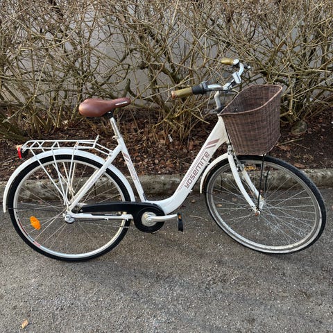 Ortler barncykel med 24" hjul. Cykeln har lågt insteg, vit ram och bruna detaljer på sadel och handtag. Utrustad med framkorg, pakethållare bak, skärmar och navväxel med vridreglage på styret. Lämplig för barn som passar storlek 24"-cykel för vardags- och skolcykling.