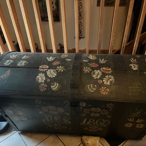 Allmogekista i trä från 1832. Kistan är grönmålad med handmålade blommotiv och initialerna HCD på framsidan. Invändigt finns äldre bilder och dekorationer monterade i locket. Kistan står på utsvängda ben och har metallbeslag framtill. Passar som förvaringsmöbel eller som inredningsdetalj i hem med lantlig eller traditionell stil.