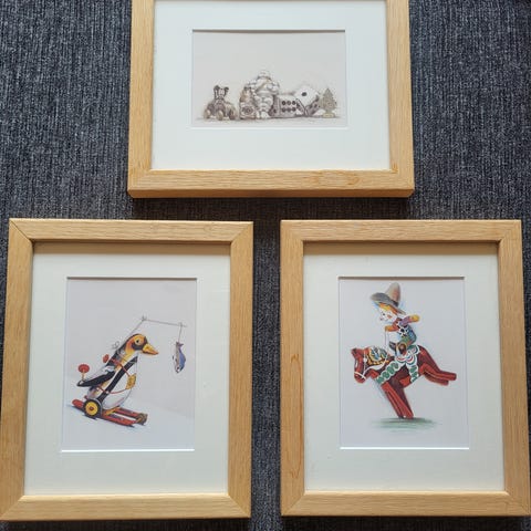 IKEA tavlor med motiv av Lasse Åberg. Flera inramade konsttryck med olika motiv, bland annat djur och figurer i typisk Åberg-stil. Samtliga verk är inramade i profilerade guldfärgade ramar med passepartout. Passar som väggdekoration i exempelvis vardagsrum, hall eller kontor.