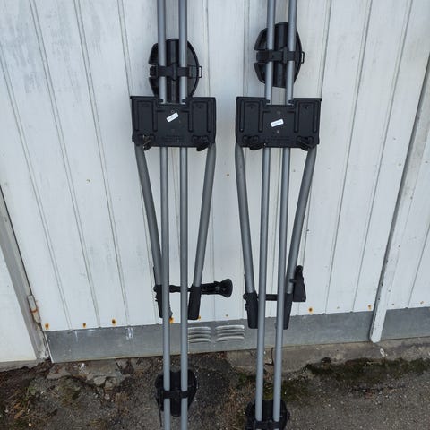 Thule cykelhållare för montering på takräcke. Modellen är avsedd för transport av en cykel per hållare. Konstruktionen är i huvudsak av aluminium med detaljer i plast och stål. Maxlast enligt märkning är 17 kg per hållare och produktens egen vikt är cirka 3,5 kg. Hållaren fästs på befintligt takräcke och har justerbara armar och remmar för att fixera cykelns hjul och ram. Lämplig för transport av standardcyklar inom angiven maxvikt. 800kr styck, 3st för 2000