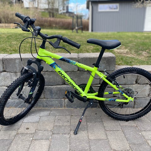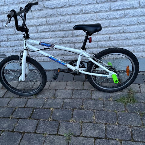Rockrider ST 120 barncykel med 20" hjul. Cykeln har vit och blå ram, styre och sadel anpassad för barn. Lättvikt. Ringklocka. Utrustad med 6 växlar, handbroms fram och samt grovmönstrade däck som passar för cykling på både asfalt och lättare grusvägar. Reflexer bak och fram, en extra i hjulet bak och på pedalerna. Pumpad och tvättad. Bara att använda direkt!