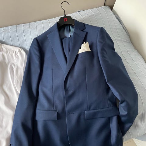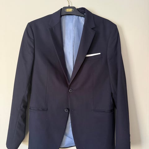 Kostym Selected för herr i marinblå färg, tillverkad i polyester i storlek 46. Består av kavaj med två knappar framtill och bröstficka samt matchande kostymbyxor med knapp och fickor. Passar för exempelvis arbete, fest eller andra mer formella tillfällen. Använd endast 1 gång på studentavslutning. Längd på byxa 101mm, grenlängd 76mm, midjemått 84mm. Finns ca 4cm kvar att sys ner vid behov. Nypris 1800:-