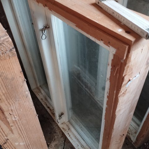 Kommer från ett äldre hus så virket håller hög kvalitet. Bredd: 1,75 Djup: 13 Höjd: 1,40 Gångjärnen samt fönsterkrokar sitter kvar . Lämplig fönster ram till äldre hus / sommarstuga.