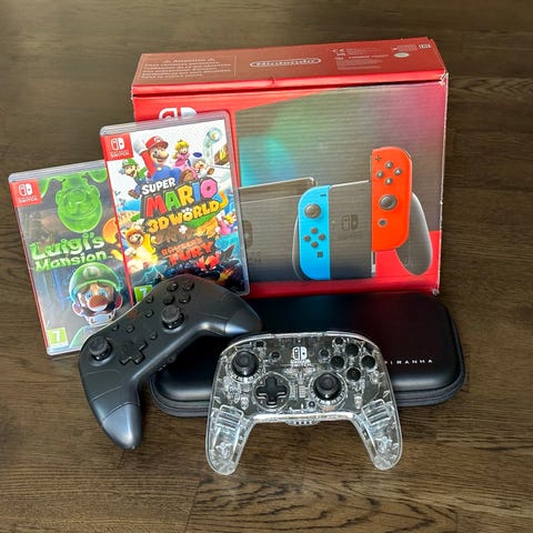 säljer här ett Nintendo Switch i kartong med 10 spel, en extra kontroll, rattar till joy-con och även 2 mikrofoner till. (Mikrofonerna är en billig kopia)