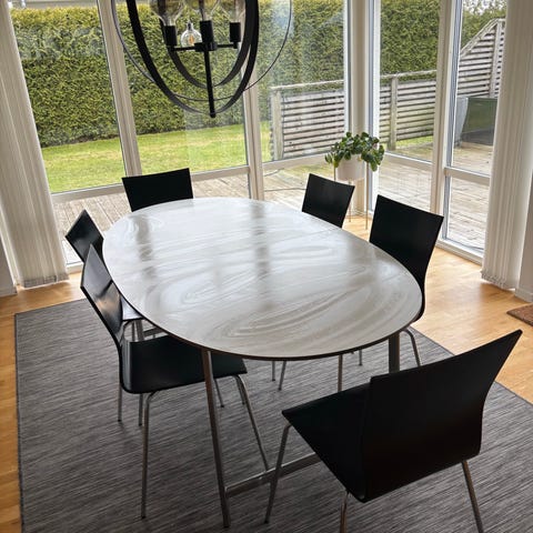 Bordet är stabilt och väldigt hållbart. Det har en liten skada men är annars i bra skick. Praktisk ytbehandling som gör det enkelt att torka bort fläckar, även av t.ex. rödvin eller kaffe. Nypris över 20 000 kr