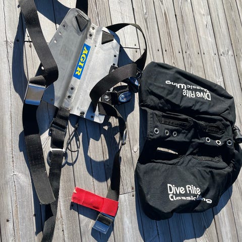 Utrustningen på bilderna omfattar bland annat torrdräkt, dykväst/BCD, dykflaskor, regulatorer, fenor, handskar, huva, lampa, karbiner och övriga tillbehör.