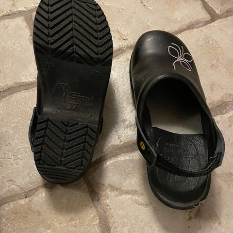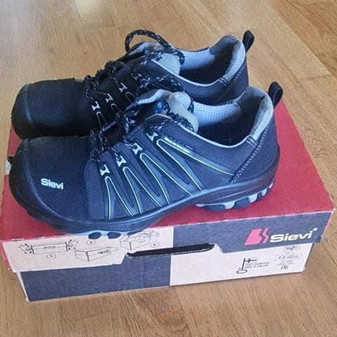 Sievi skor i storlek 36. Modellen är lågskor med svart ovandel och rosa detaljer samt kontrastsömmar. Ovandelen verkar vara i ett kombinerat material av textil och syntet/läderliknande material. Skorna har grovmönstrad yttersula för bra grepp och snabbsnörning med ratt/vridknapp. Passar som vardagsskor eller arbetsskor beroende på behov.
