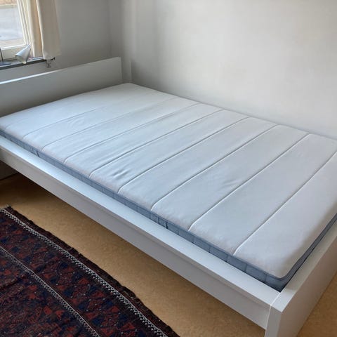 IKEA säng med madrass. Sängen har en vit sänggavel i trä och en ljus madrass med quiltat mönster. Benen är i trä och sängen står direkt på golvet utan sängram runtom. Passar som enkelsäng i sovrum, gästrum eller tonårsrum.