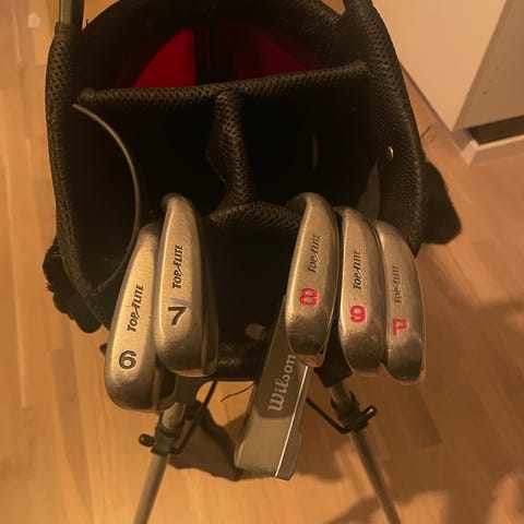 Passar för träning, spel på bana eller som nybörjarset. Kontrollera antal klubbor, skaftlängd och grepp vid intresse.