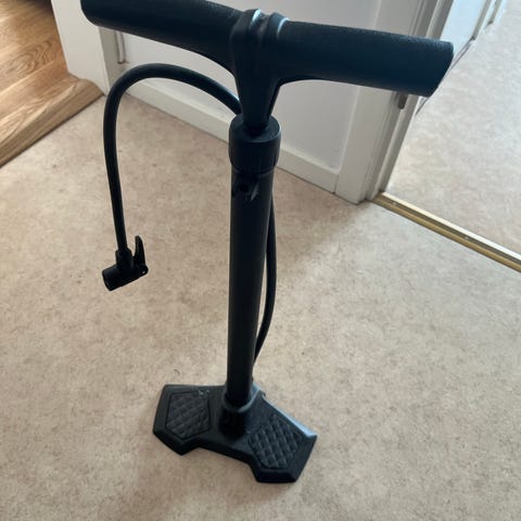 Cykelpumpar i golvmodell i metall, en grön och en blå. Båda pumparna har slang med munstycke och fotstöd för stabilitet vid pumpning. Passar för pumpning av cykeldäck och andra uppblåsbara produkter med kompatibel ventil. Trähandtag på den gröna pumpen och plast-/metallhandtag på den blå.