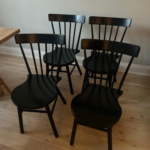 6st svarta pinnstolar/karmstolar i använt skick. Finns lacksläpp och repor. Från Trendrum modell Sandhamn.