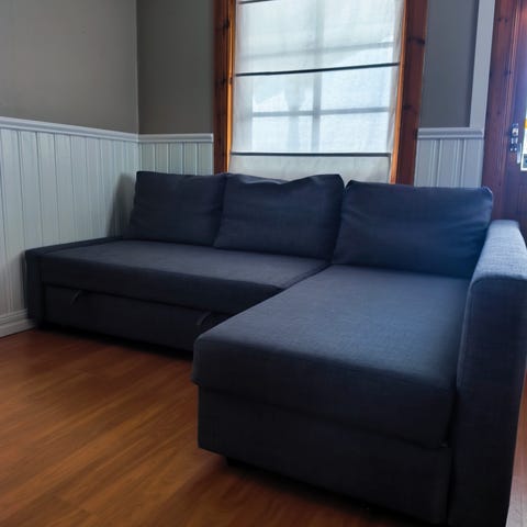 Soffan är i använt men bra skick. Perfekt för mindre lägenhet eller gästrum, fungerar både som soffa, extrasäng och smart förvaring. Förvaringsdelen rymmer filtar, kuddar eller sängkläder, och bäddfunktionen gör den smidig när man får gäster. Sista bilden är hur den ser ut med grå klädsel.