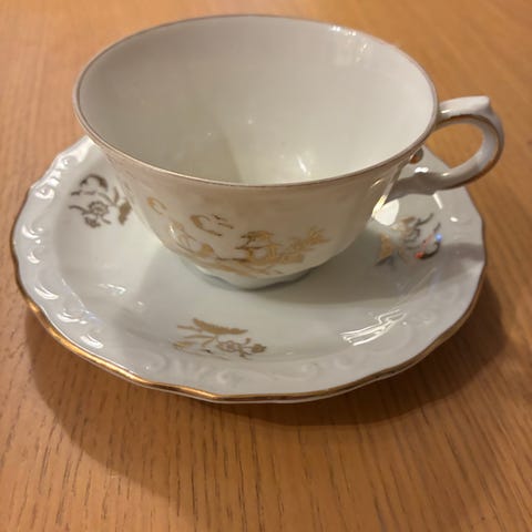 En söt liten kaffekopp med fat och vackert blomstermotiv. Rosenthal, Bavaria, märkt "E", 1900-talets första hälft. Helt felfri, inga nagg eller sprickor. Koppen: 7,3 cm (diameter), 4,5 cm (höjd) Fatet: 11,2 cm (diameter)
